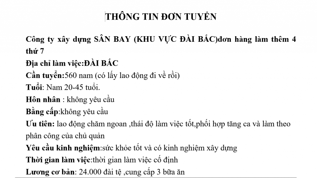 Công ty xây dựng SÂN BAY (KHU VỰC ĐÀI BẮC)đơn hàng làm thêm 4 thứ 7